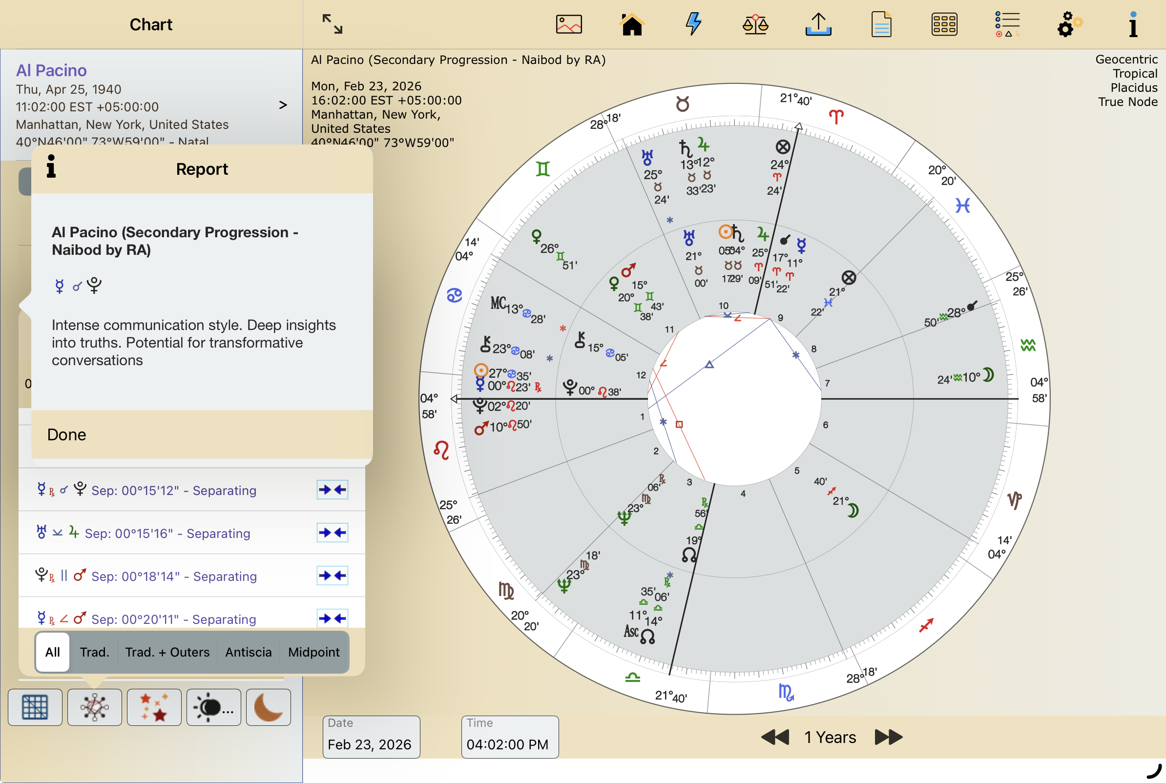 Modern – interpretations are available via the Aspect Table and Speculum for many aspects. For single-wheel and bi-wheel. Most charts inc natal/radix. Uranian not available.