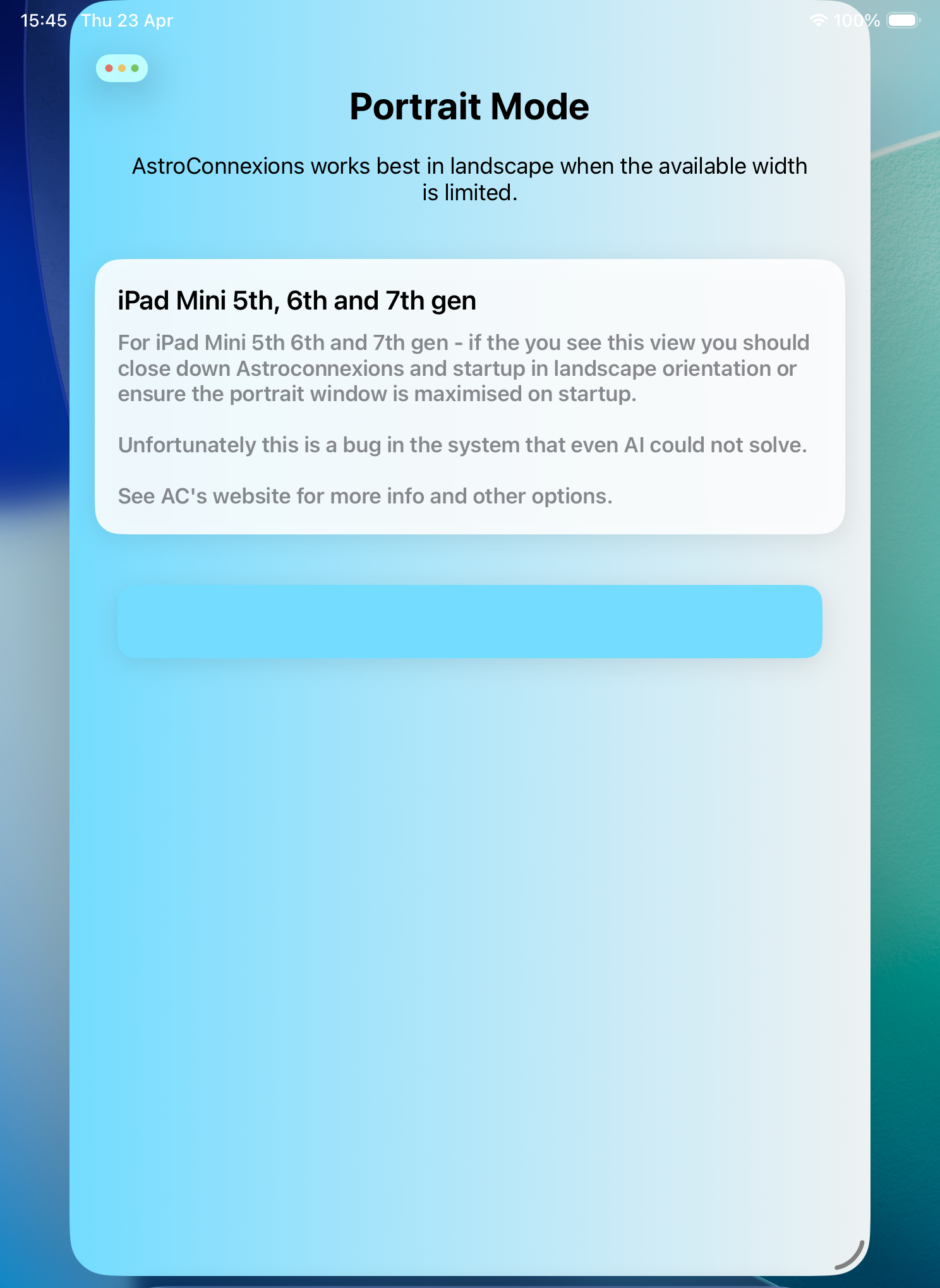 A warning message is displayed explaining what to do. Close down AC and startup in landscape mode. Do not resize the window in portrait mode as this might cause the split view to collapse. See the screenshot below: