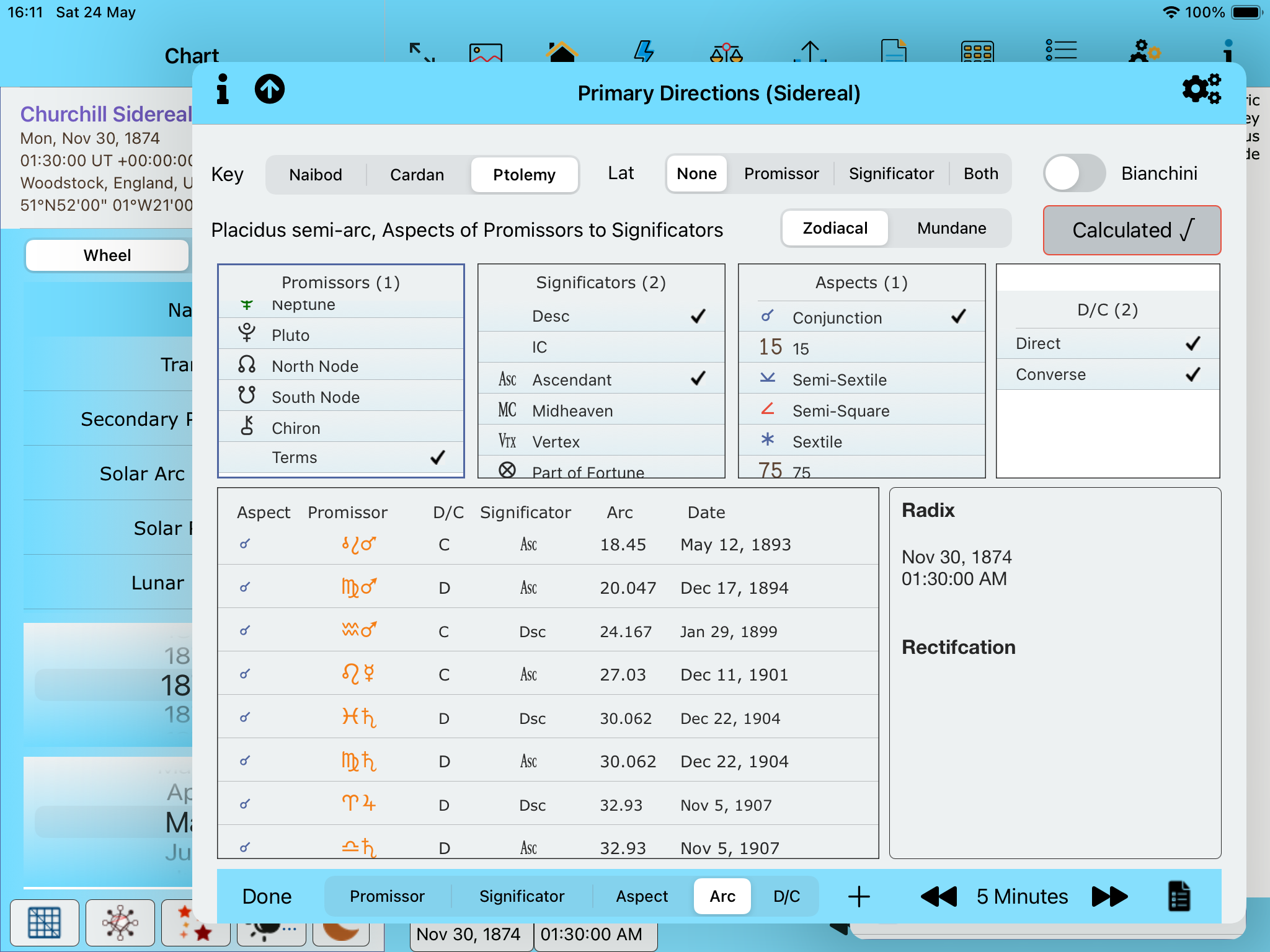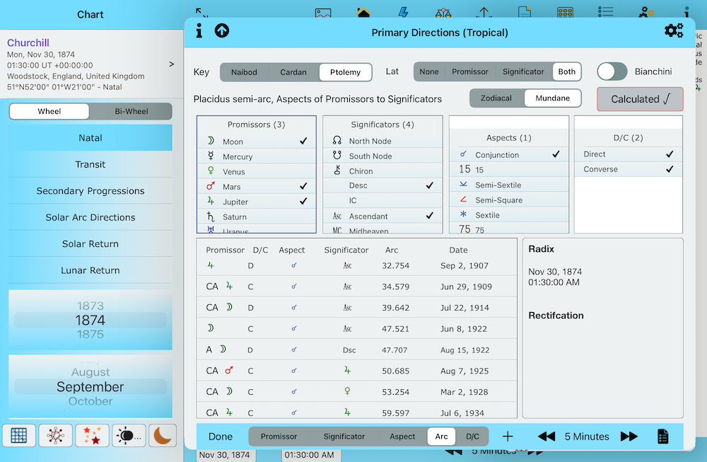 Example Chart: Winston Churchill: Tropical, Mundane. Antiscia. iPad/Mac – ver 3.35, iPhone ver 1.38